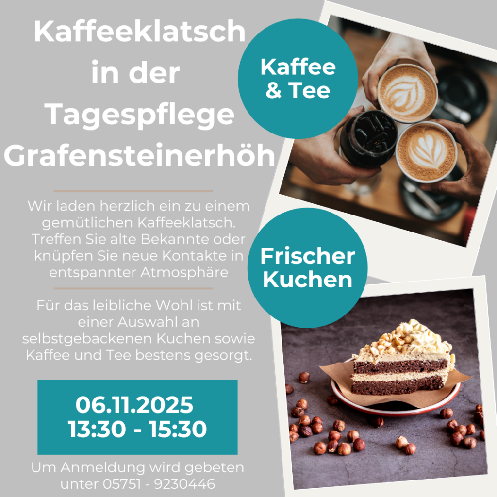 Wir laden Sie herzlich am 06.11.2025 zu einem gemütlichen Kaffeeklatsch in die Tagespflege Grafensteinerhöh ein.